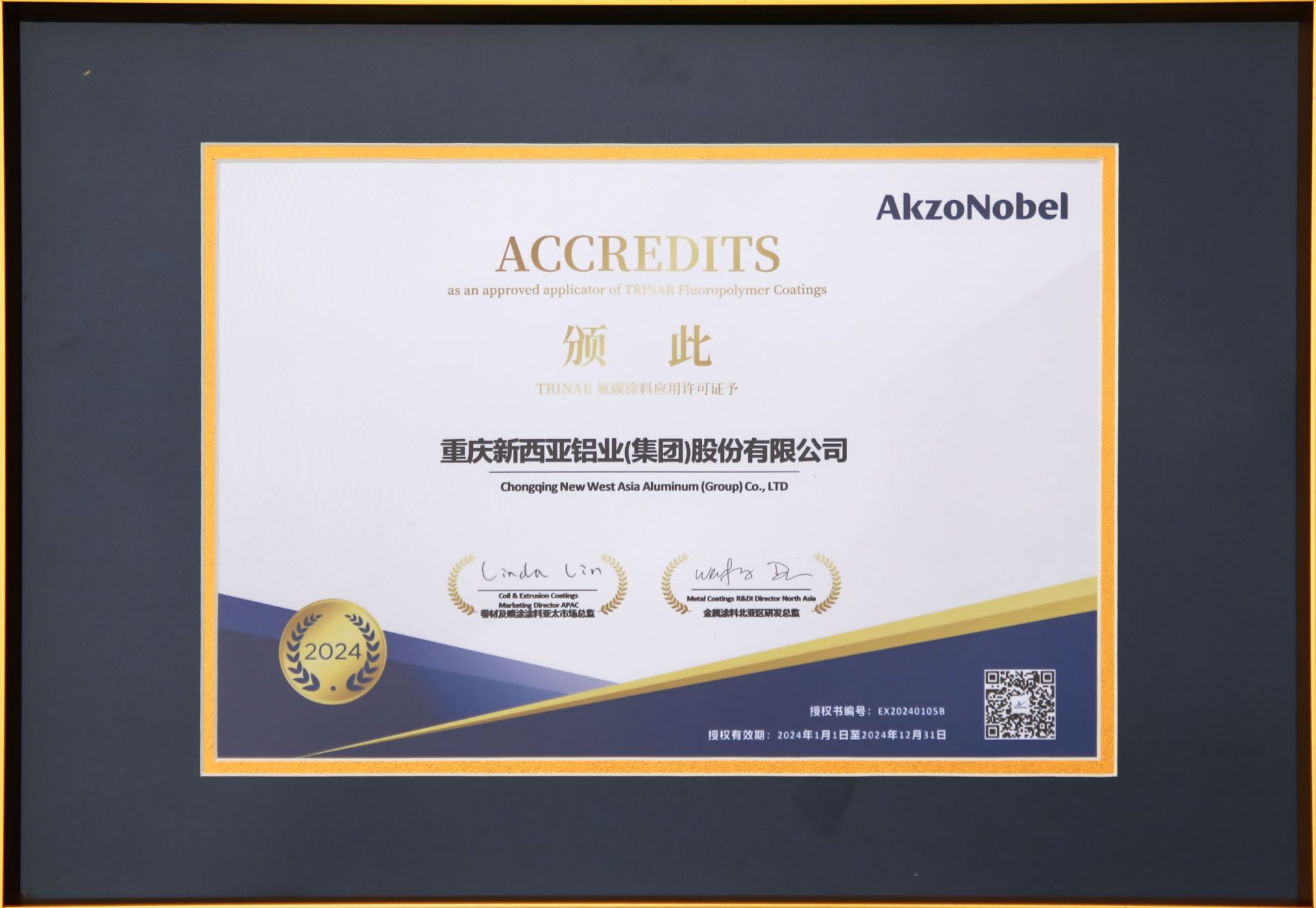 阿克蘇諾貝爾TRINAR氟碳涂料應(yīng)用許可證