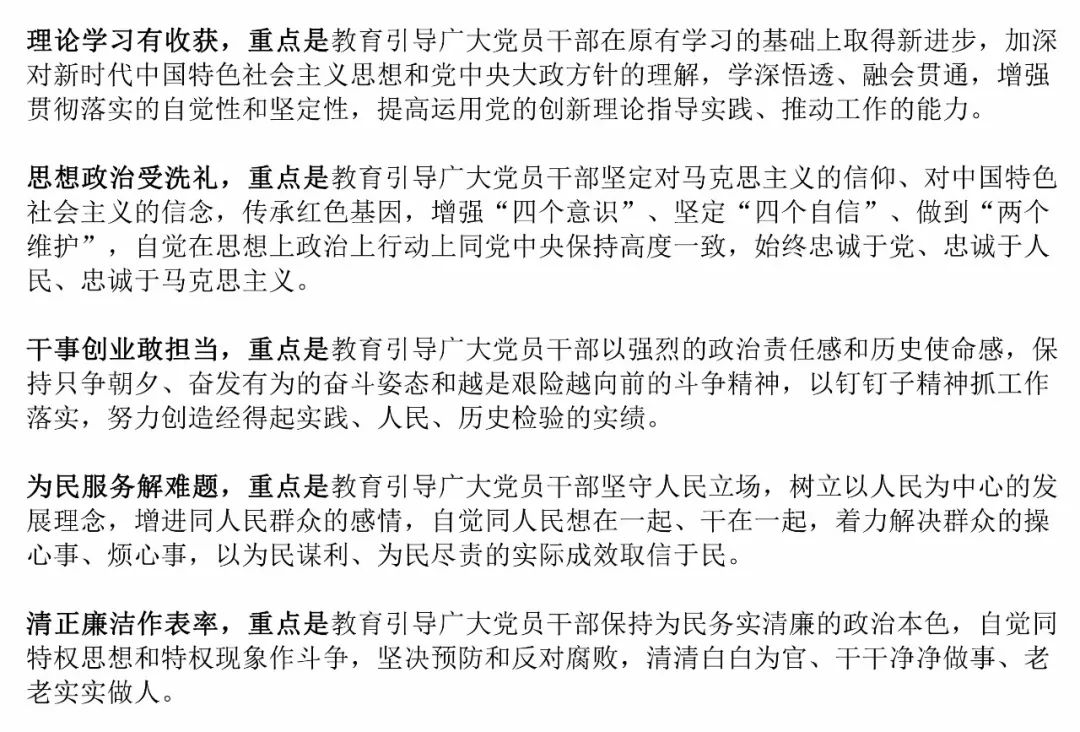 具體目標(biāo)是理論學(xué)習(xí)有收獲、思想政治受洗禮、干事創(chuàng)業(yè)敢擔(dān)當(dāng)、為民服務(wù)解難題、清正廉潔作表率。