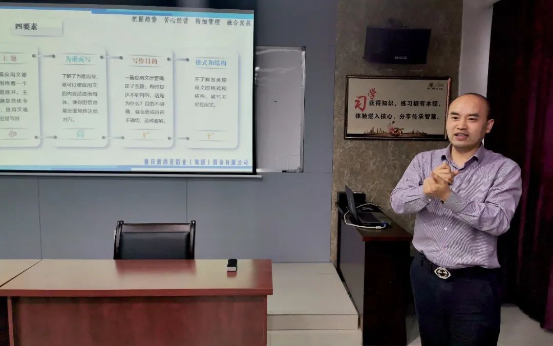公司總經理劉斌圍繞應用寫作的特征、種類、性質、特點、格式、專用語言在內的應用寫作基本內容給予了知識講解,從“為什么要重視寫作、如何學習寫作、應用寫作關鍵點在哪里”三個方面就如何提升應用寫作能力進行了詳細闡述,結合個人工作經驗,表達了“會寫材料的人不是主要因為會寫,而是因為深入思考。”讓參會人員對如何寫好應用文有了一個全新的、更高層次的認知。