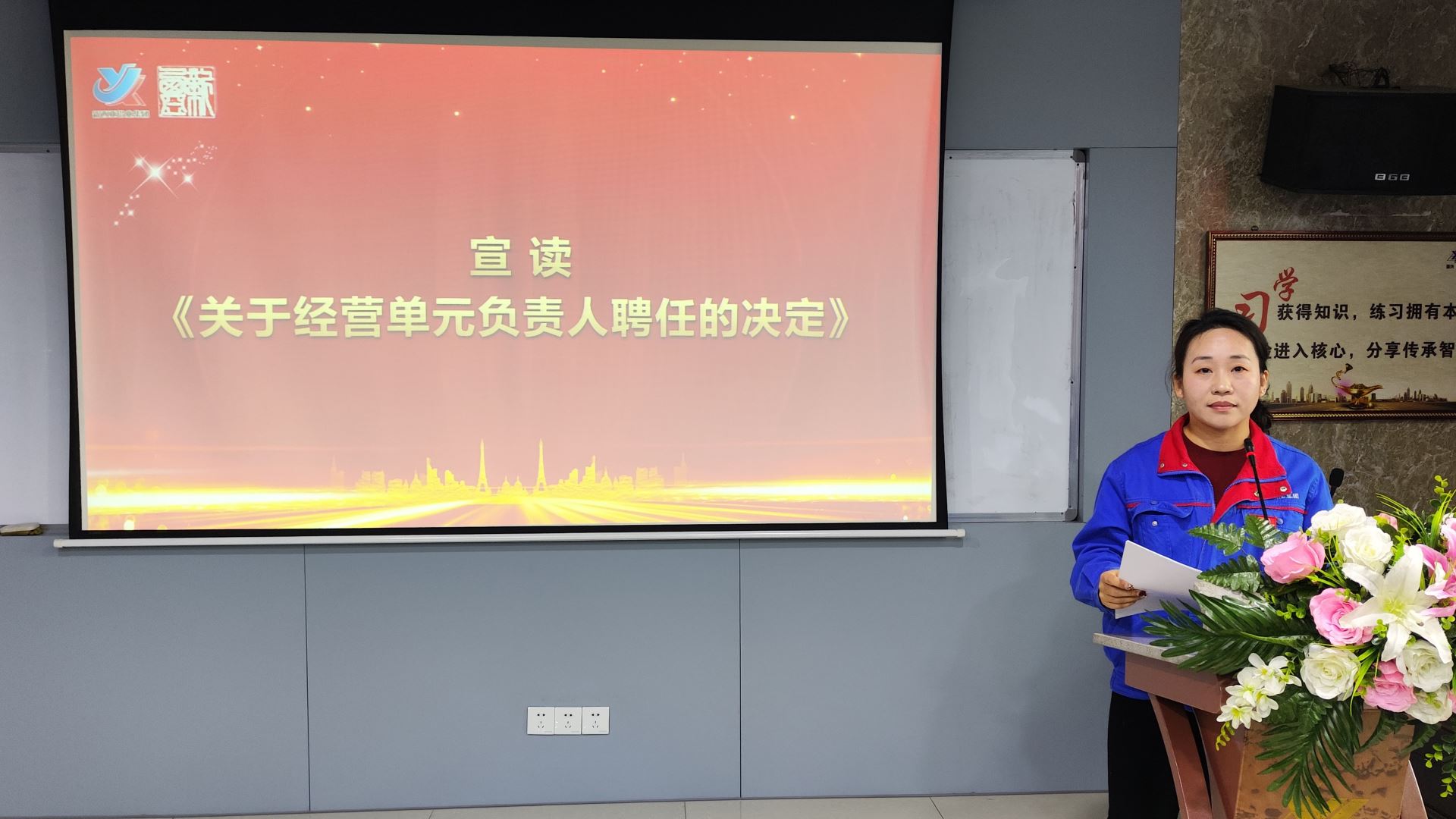 財務(wù)管理部經(jīng)理宋玉芳宣讀了《關(guān)于經(jīng)營單元負(fù)責(zé)人聘任的決定》,隨后,劉斌董事長向各經(jīng)營單元授隊旗,象征著新西亞人勇攀高峰的決心。